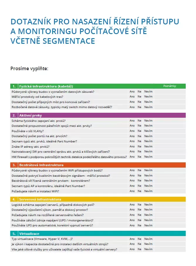 Dotazník pro nasazení řízení přístupu a monitoringu počítačové sítě včetně segmentace.